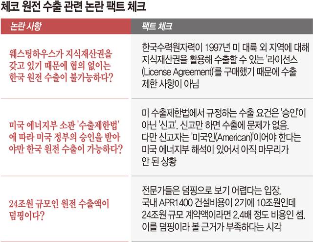 물론 수출통제법은 한국 입장에선 거쳐야 할 절차인 것은 맞는다. 미국에서 한국으로 ‘이전된 기술’이기 때문이다. 다만 일부 언론에 보도된 것처럼 ‘승인’을 받아야 하는 건 아니다. 문주현 단국대 에너지공학과 교수는 “이는 핵확산 방지를 위해 마련된 조항으로, 미국에서 원전 기술을 전수받은 국가가 제3국에 수출할 때 핵무기 등으로 전용되는 걸 막기 위한 것”이라며 “평화적 이용 목적은 문제 될 부분이 없다”고 설명했다. 실제 체코에 대한 한국 원전 수출은 ‘신고’ 대상이다.