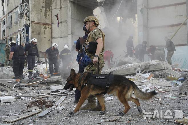 [하르키우=AP/뉴시스] 24일(현지시각) 우크라이나 하르키우에서 우크라이나 군인과 수색견이 러시아군의 공격으로 무너진 아파트 건물을 수색하고 있다. 이날 러시아의 공격으로 주민 3명이 숨지고 최소 24명이 다쳤다. 2024.09.25.