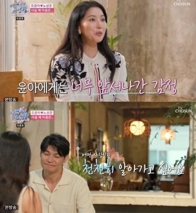 24일 방송된 TV조선 예능 프로그램 '공개연애-여배우의 사생활'에서는 예지원, 오윤아, 이수경이 썸남들과 마지막 데이트를 나서는 장면이 그려졌다. 이날 방송에서 오윤아는 노성준과의 마지막 데이트를 함께했다.