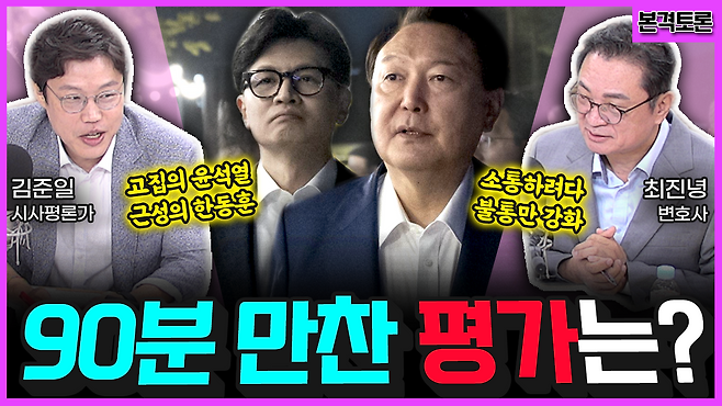 ▷ 고성국 : <본격 토론> 진행해드리고 있습니다. 수요일의 남자 최진녕 변호사 그리고 최진녕 변호사를 좋아한다는 김준일 평론가와 함께하고 있습니다. 어제 만찬에 대한 두 분들의 평 그리고 재독대 요청에 대한 전망까지 말씀을 들었는데 이제 이 주제 하나만 더 다루고 다른 주제로 갈게요. 이제 이번 이 만찬을 둘러싼 이런저런 얘기 중에 이른바 언론플레이, 언플 얘기가 많이 나왔어요. 정치인들이 언론플레이 안 할 수 없죠. 그게 직업이기도 하고 그렇지만 해야 될 때가 있고 해서는 안 될 때도 또 있을 것 같은데 그 점은 어떻게 보시는지요.