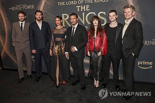 Actors Charlie Vickers, from left, Benjamin Walker, Cynthia Addai-Robinson, Ismael Cruz Cordova, Markella Kavenagh, Robert Aramayo and Charles Edwards attend the premiere of Prime Video's "Lord of the Rings: Rings of Power" season two at The Whitby Hotel on Tuesday, Sept. 24, 2024, in New York. (Photo by Andy Kropa/Invision/AP) 092424130855, 21334631,