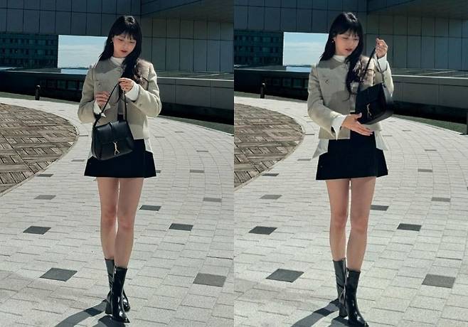 이날 엄현경은 블랙 미니스커트에 그레이 색상의 자켓을 착용해 시크하면서도 세련된 분위기를 드러냈다.