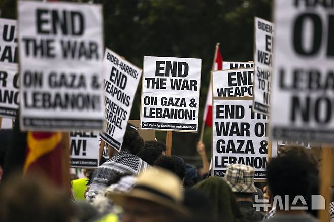 [로스앤젤레스=AP/뉴시스] 24일(현지시각) 미 캘리포니아주 로스앤젤레스 연방 청사 앞에서 가자지구와 레바논 전쟁에 반대하는 시위대가 손팻말을 들고 있다. 2024.09.25.