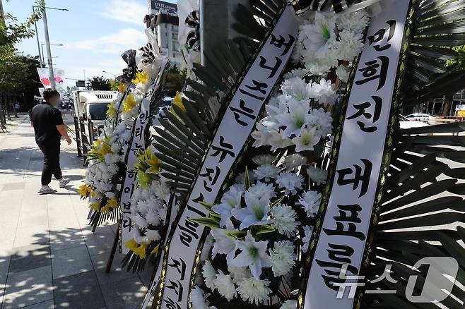 사진은 이날 서울 용산구 하이브 사옥 앞에 놓여진 팬들이 보낸 근조화한. 2024.9.25/뉴스1