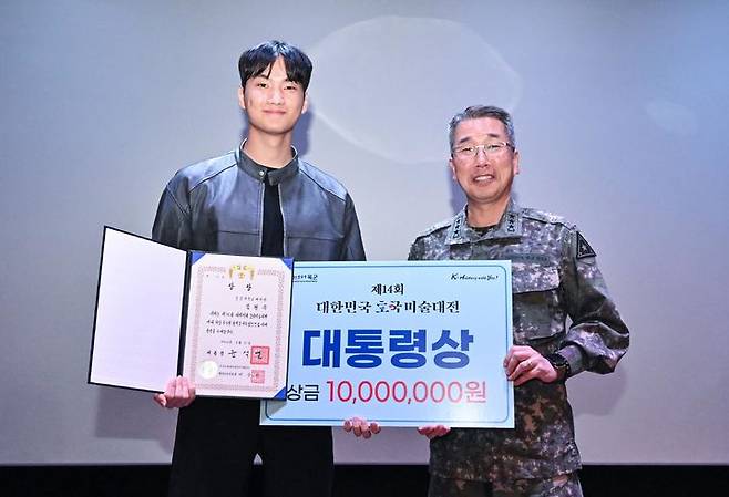 [서울=뉴시스] 고현석 육군참모차장이 25일 서울 용산구 전쟁기념관에서 열린 제14회 대한민국 호국미술대전에서 대상을 차지한 김형우 작가와 기념촬영을 하고 있다. (사진=육군 제공) 2024.09.25. photo@newsis.com *재판매 및 DB 금지