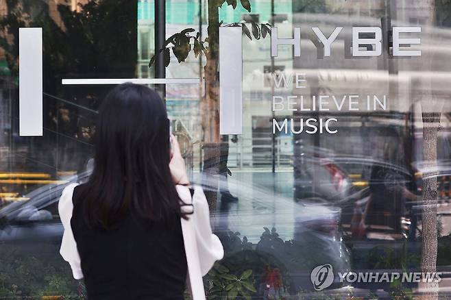 (서울=연합뉴스) 진연수 기자 = 그룹 뉴진스 멤버들이 하이브에 민희진 전 어도어 대표 복귀를 요구하며 제시한 시한인 25일 서울 용산구 하이브 사옥 앞에서 팬이 사진을 찍고 있다. 2024.9.25