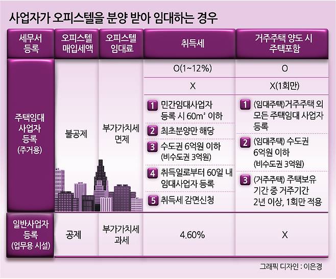 반대로 임차인이 사무실 업무용 시설로 사용하는 경우 오피스텔 사업자는 오피스텔 취득 시 부담한 매입세액을 공제받을 수 있습니다. 또 오피스텔 월세를 받는 임대료는 부가가치세 과세 대상이 됩니다. 이 때문에 과세사업자로 ‘일반임대사업자’ 등록을 해야 합니다. 각자 세금적 측면에서의 특성이 다른 것이죠.