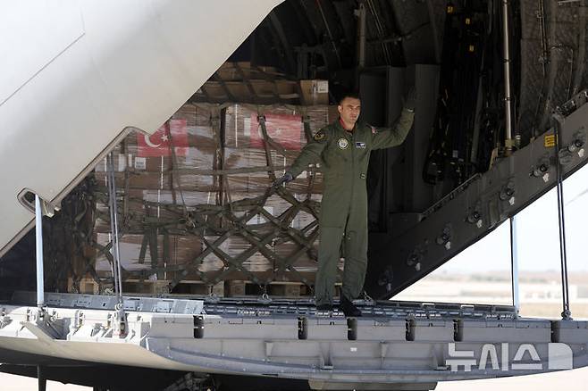 [베이루트=AP/뉴시스] 25일(현지시각) 레바논 베이루트 국제공항에 도착한 튀르키예 공군 수송기에서 튀르키예 병사가 의료 구호품을 하역하고 있다. 2024.09.25.