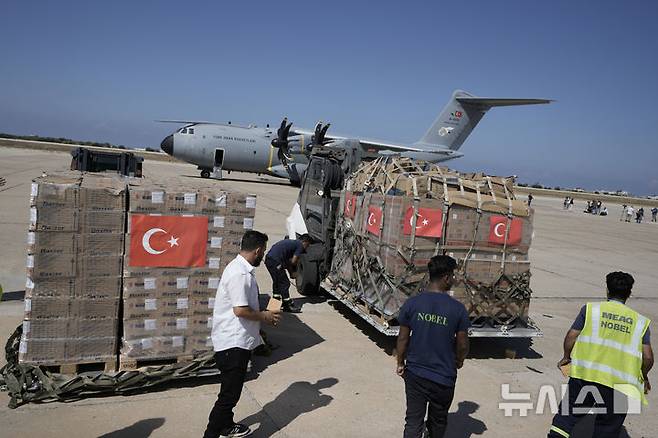 [베이루트=AP/뉴시스] 25일(현지시각) 레바논 베이루트 국제공항 근로자들이 튀르키예 의료 구호품을 수송기에서 내려 옮기고 있다. 2024.09.25.