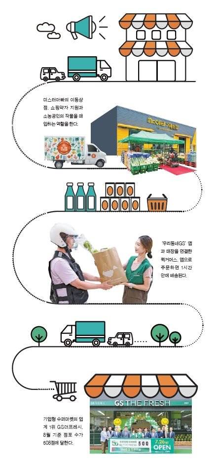 체인 오퍼레이션은 가맹사업에도 상승효과를 줬다. 규모의 제약을 덜 받아 다양한 입지 출점이 가능해져서다. 구도심 상권은 개인 슈퍼마켓을 GS더프레시로 전환해 안정적인 매출을 확보하는 일에 집중하고, 신도시의 신규 점포는 예전보다 적은 평수에 슈퍼를 여는 게 가능하단 점을 노렸다. 신도시 점포는 지역에 거주하는 30대 신혼부부가 주요 타깃이다. 온라인쇼핑과 모바일 소비에 익숙한 타깃층에 맞게 퀵커머스를 특화한 것도 유효했다. ‘우리동네GS 앱’을 활용해 물건을 주문하면 1시간 안에 도착하는 배송서비스다. 김 매니저는 “우연히 들린 슈퍼에서 상품을 보고 괜찮다고 느낀 소비자라면 앱으로 주문할 확률도 늘어난다. 만약 받은 상품에 문제가 있다면? 집과 가까운 곳에 슈퍼가 있으니 교환도 빠르다”고 설명한다. 현재 ‘우리동네GS 앱’ 사용자는 360만 명(MAU 기준)이며 GS더프레시는 연간 매출액 2조 원을 바라보는 브랜드로 성장하고 있다.