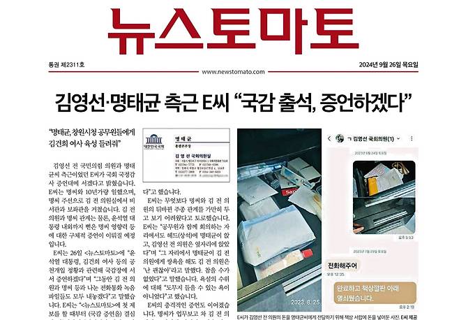 뉴스토마토에 대통령 부인 김건희의 공천 개입 의혹을 제보한 사람이 명태균으로부터 들었다는 김건희의 육성 일부다. 뉴스토마토가 26일 1~3면에 걸쳐 관련 의혹을 후속보도했다.
