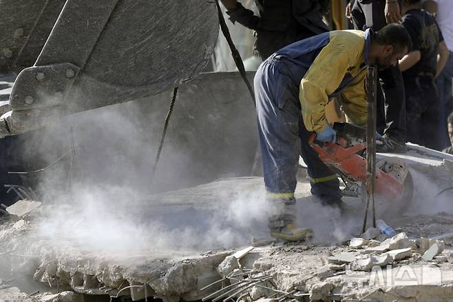 25일(현지시각) 레바논 베이루트 북쪽 마이사라 마을에서 구조대원이 이스라엘의 공습을 받은 피해 현장에서 생존자를 수색하면서 콘크리트 블록을 자르고 있다.