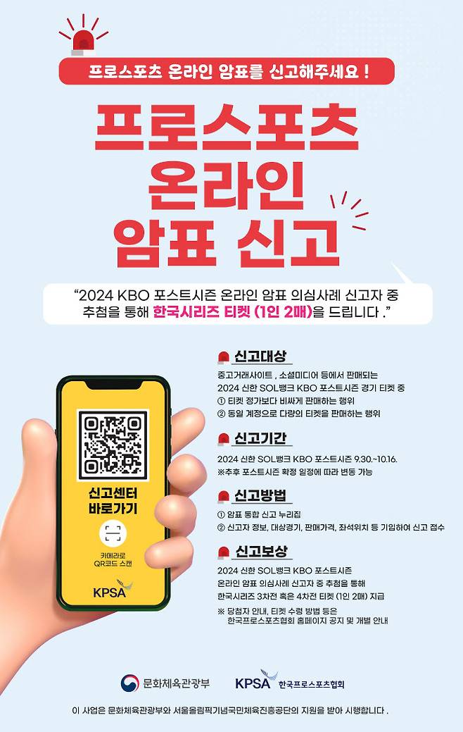 정부가 프로야구 포스트시즌 암표 의심 사례를 신고할 경우, 추첨을 통해 한국시리즈 입장권을 지급한다.