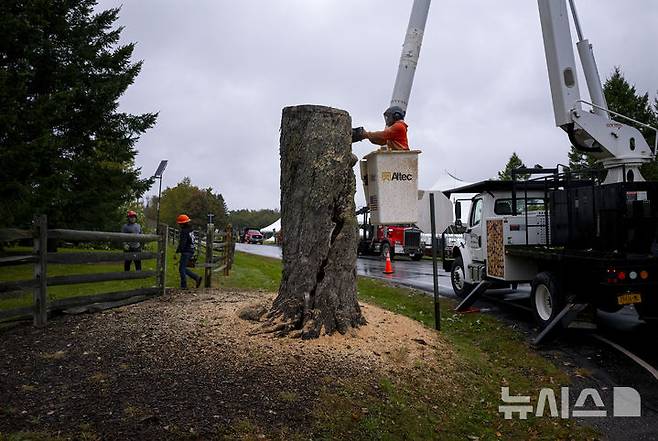 [베셀=AP/뉴시스] 25일(현지시각) 미 뉴욕주 베셀 아트센터에 있는, 우드스톡 페스티벌의 전설적인 '메시지 나무'가 잘려 나가 밑동만 남아 있다. 관계 당국은 100년 이상 된, 높이 18m가량의 이 나무 상태가 나빠져 쓰러질 위험에 처해 많은 아쉬움 속에 잘라야 했다고 전했다. 휴대전화가 없던 1969년 우드스톡 페스티벌이 처음 시작할 때부터 관람객들은 종이나 판지에 메시지를 적어 공연 안내소 옆에 있던 이 나무에 붙여 소통한 것으로 유명하다. 2024.09.26.