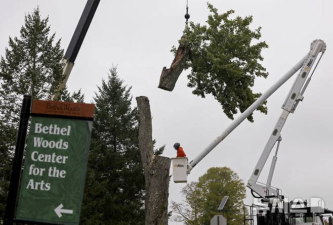 25일(현지시각) 미 뉴욕주 베셀 아트센터에 있는, 우드스톡 페스티벌의 전설적인 '메시지 나무'가 잘려 나가고 있다.