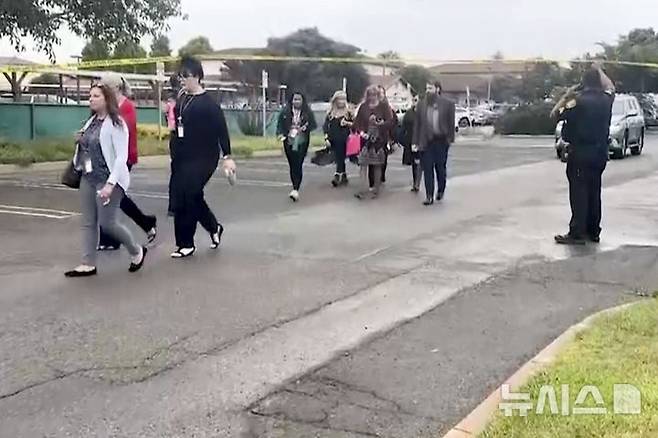 [샌타마리아=AP/뉴시스] KEYT TV가 제공한 영상 캡처 사진에 25일(현지시각) 미 캘리포니아주 샌타마리아 법원에서 폭발이 일어난 후 사람들이 경찰의 통제선 밖으로 나오고 있다. 현지 경찰은 이 폭발로 최소 5명이 다쳤으며 20세 남성이 용의자로 체포해 범행 동기를 조사하고 있다고 밝혔다. 2024.09.26.