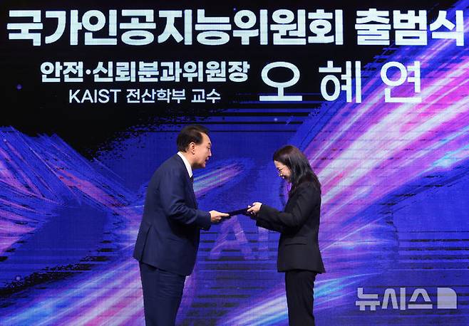 [서울=뉴시스] 조수정 기자 = 윤석열 대통령이 26일 서울 종로구 포시즌스호텔에서 열린 국가인공지능위원회 출범식 및 1차회의에서 KAIST 전산학부 교수인 오혜연 안전·신뢰분과위원장에게 위촉장을 수여하고 있다. 2024.09.26. chocrystal@newsis.com