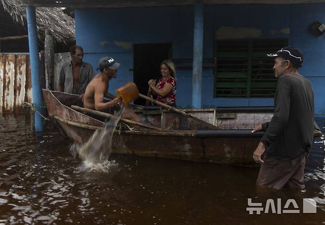 [과니마르=AP/뉴시스] 25일(현지시각) 쿠바 아르테미사주 과니마르에 허리케인 헬렌이 지나간 후 한 남성이 보트를 타고 침수 거리를 지나 이웃들과 얘기를 나누며 배 안의 물을 퍼내고 있다. 2024.09.26.