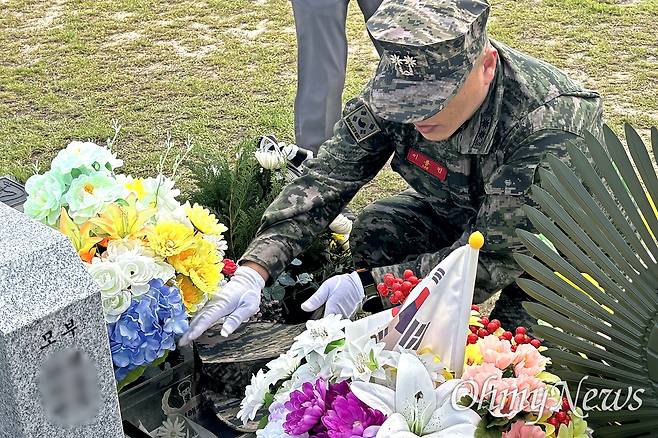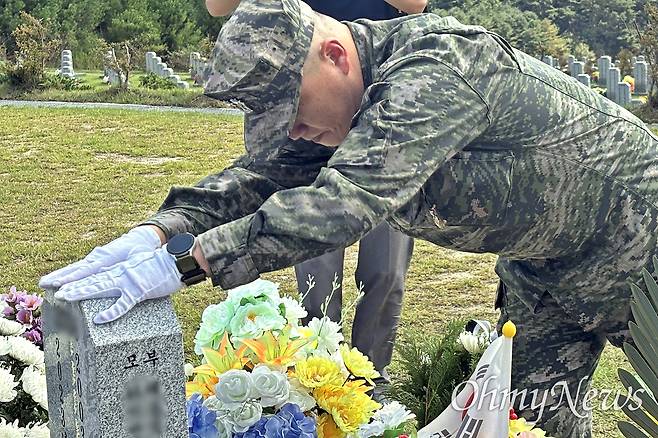 | ▲ 고 채수근 상병이 속한 해병대 1292기의 전역 날인 26일 오후, 채 상병의 대대장이었던 이용민 중령이 대전 현충원의 묘를 찾아 전역모를 전했다. |