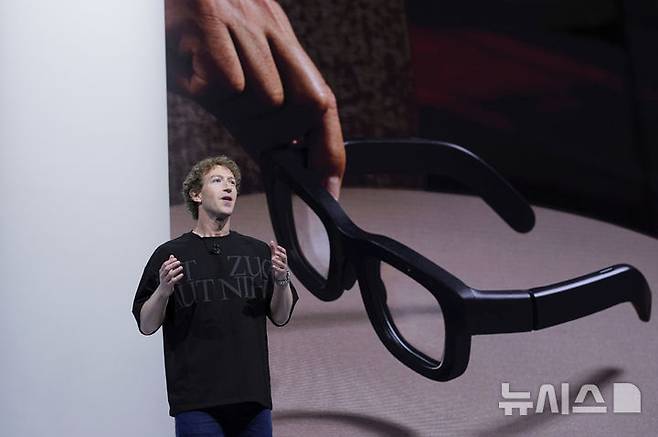 [멘로파크=AP/뉴시스] 마크 저커버그 메타플랫폼(메타) 최고 경영자(CEO)가 25일(현지시각) 미 캘리포니아주 멘로파크 메타 본사에서 열린 연례 개발자 콘퍼런스 '커넥트 2024' 중 레이밴 메타 스마트 안경 '오라이언'을 소개하고 있다. 메타는 이날 스마트폰의 뒤를 이을 안경처럼 쓰는 증강현실(AR) 스마트 안경 '오라이언' 시제품을 공개했다. 검은색 뿔테 안경처럼 생긴 '오라이언'은 안경처럼 쓰면서 문자 메시지는 물론 화상 통화, 유튜브 동영상까지 볼 수 있다. 2024.09.26.