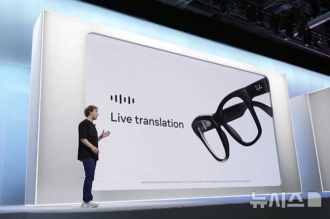 [멘로파크=AP/뉴시스] 마크 저커버그 메타플랫폼(메타) 최고 경영자(CEO)가 25일(현지시각) 미 캘리포니아주 멘로파크 메타 본사에서 열린 연례 개발자 콘퍼런스 '커넥트 2024' 중 레이밴 메타 스마트 안경 '오라이언'의 실시간 번역 기능을 소개하고 있다. 메타는 이날 스마트폰의 뒤를 이을 안경처럼 쓰는 증강현실(AR) 스마트 안경 '오라이언' 시제품을 공개했다. 검은색 뿔테 안경처럼 생긴 '오라이언'은 안경처럼 쓰면서 문자 메시지는 물론 화상 통화, 유튜브 동영상까지 볼 수 있다. 2024.09.26.