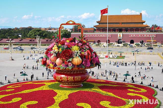 [베이징=신화/뉴시스] 25일 중국 베이징 톈안먼 광장에 '축복조국'이라는 내용이 담긴 꽃바구니가 설치돼 있다. 높이 18m의 이 꽃바구니 조형물은 10월 1일부터 시작하는 중국 국경절 연휴를 앞두고 지난 22일 광장에서 공개됐다. 2024.09.26.