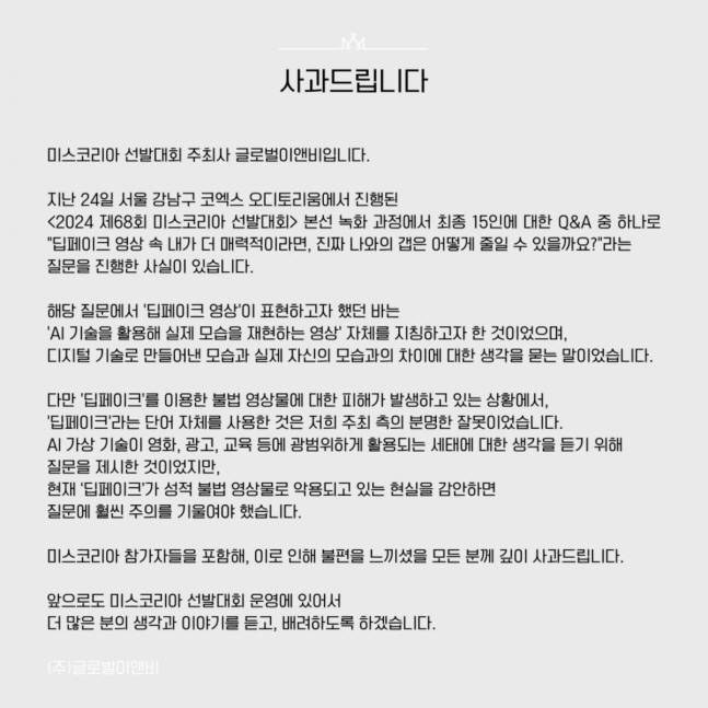 미스코리아 선발대회 주최사 글로벌이앤비는 26일 공식 계정에 사과문을 올렸다. 지난 24일 서울 강남구 코엑스 오디토리움에서 진행한 본선 녹화에서 최종 15인에게 한 질문 중 "딥페이크 영상 속 내가 더 매력적이라면, 진짜 나와의 갭은 어떻게 줄일 수 있을까요?"라는 내용이 있었다.