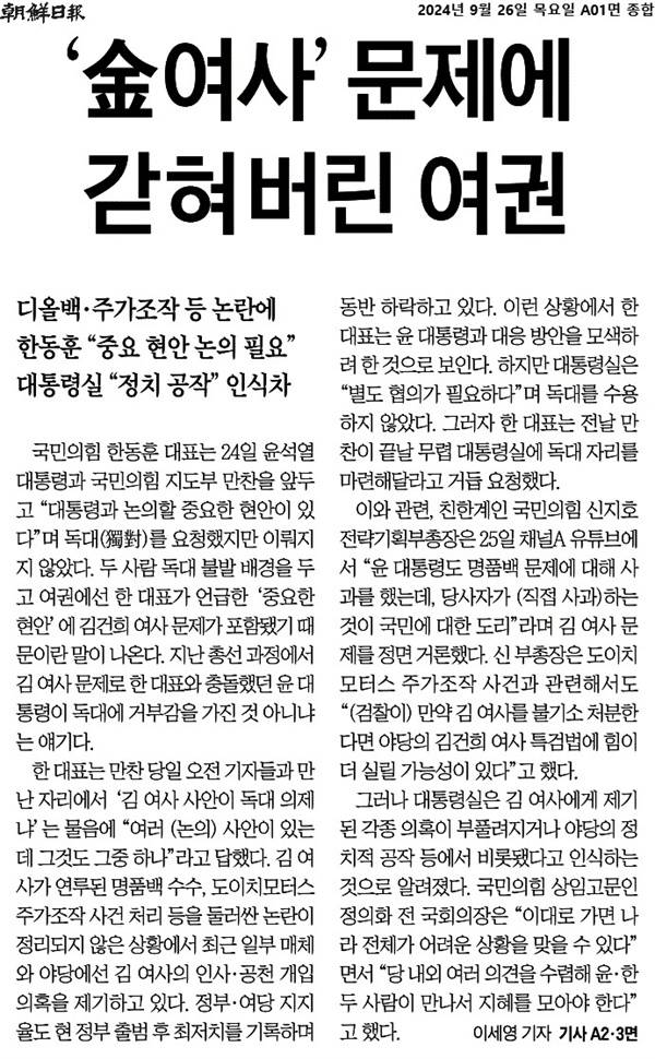 이어 "윤 대통령과 한 대표의 사이가 벌어진 것은 순전히 김 여사 문제 때문"이라며 윤 대통령의 배우자 김건희씨를 두 사람 갈등의 근본 원인으로 꼽았다. 사설은 김씨에게 명품 가방을 건넨 최재영 목사에 대해 검찰 수사심의위가 기소를 권고한 것에 대해서도 "가방을 준 최씨는 기소하고 받은 김 여사는 불기소해야 하는 상황이다. 국민 눈에는 모순으로 비칠 수밖에 없다. 국민을 납득시키려면 김 여사의 사과 등 적극적 해법이 필요하다"라며 김씨의 사과를 요구했다.