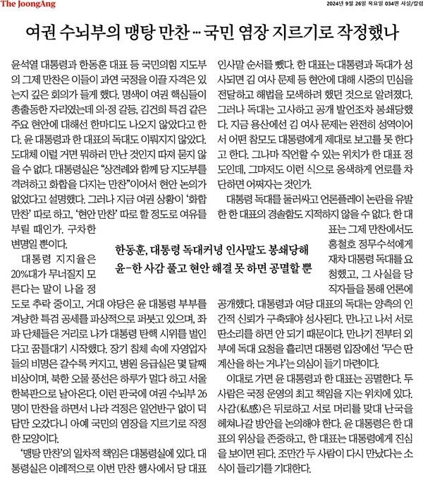 사설은 "한 대표가 대통령과 단독 만남을 요청했다는 사실이 사전에 보도된 것도 매끄럽지 못한 일이었다. 대통령을 압박하는 모양새가 될 수 있었다"라며 한 대표를 나무라면서 윤 대통령을 향해서도 "한 대표에 대한 개인적 감정 때문에 독대를 꺼린다면 곤란하다. 김 여사 문제와 의대 증원과 관련해 거북한 건의를 듣기 싫어서 피했다면 더 안될 일"이라고 지적했다.