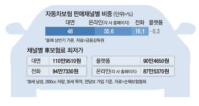실제 손해보험협회 공시에 따르면 38세 남성 운전자가 2000㏄ 중형차를 기준으로 자동차보험(35세 특약·1인·전담보 가입 조건)에 가입할 경우 CM채널을 통해서는 87만5370원이 가장 낮은 보험료로 제시됐다. 하지만 같은 조건으로 PM채널을 통해 가입하면 보험료가 90만4650원으로 3만원가량 오른다. 플랫폼에 지급하는 수수료가 보험료에 반영된 결과다.