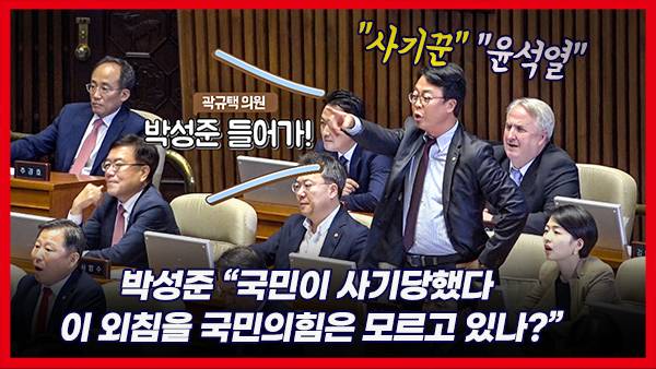 그러자 국민의힘 의원들은 박성준 부대표를 향해 '사기꾼'이라고 외치기 시작했다. 박성준 부대표는 “한석훈 위원에 대해서 우리 의총장에서 도저히 인정할 수 없다는 것이 의원들의 자율적 판단이었다”고 강조했다. 박성준 부대표가 발언하는 사이 여당 의원들의 '사기꾼' 단체 샤우팅에 맞서 야당 의원들은 '윤석열' 단체 샤우팅으로 응수했다. 영상엔 여야의 샤우팅 배틀이 생생하게 담겨있다.