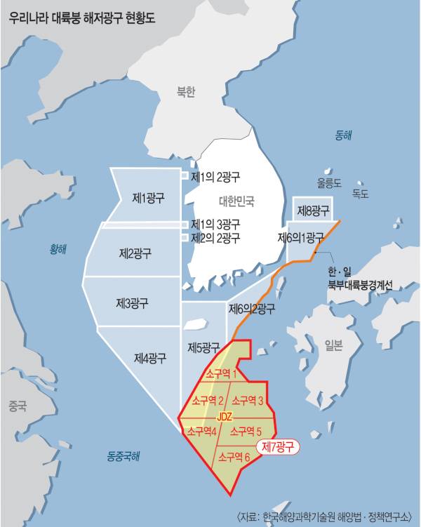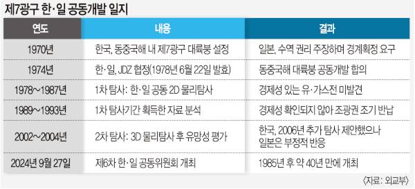 제7광구는 제주도 남쪽과 일본 규슈 서쪽 사이에 있는 대륙붕 해역이다. 전체 면적(총 8만2557㎢)이 한국 영토의 약 80%에 달한다. 한·일 양국은 1974년 JDZ 협정을 체결하고 이후 50년간 해당 지역 자원 개발을 공동 추진하기로 했다. 그러나 1985년 제5차 공동위를 개최한 뒤 39년간 협의가 중단됐다. JDZ 협정은 2028년 6월 만료되지만, 만료 3년 전인 내년 6월부터는 일방 당사국이 서면으로 협정 종료를 통보할 수 있다.