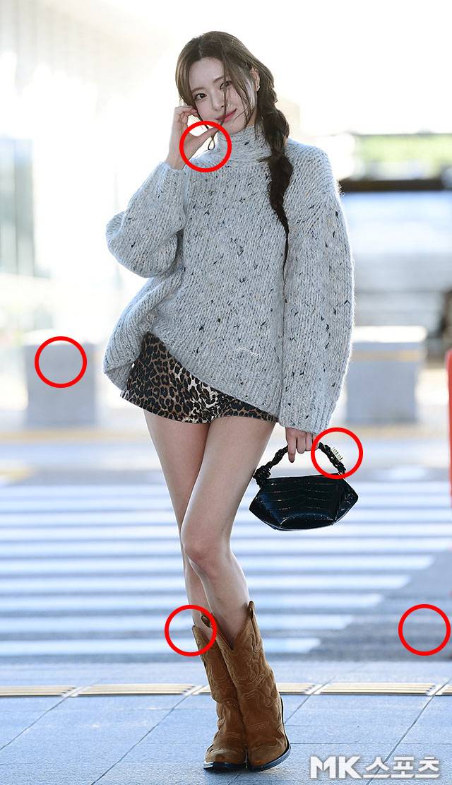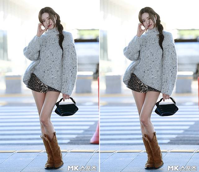 이날 출국길에서 유나는 오버핏의 니트 스웨터와 레오파드 패턴의 숏팬츠, 그리고 브라운 컬러의 웨스턴 부츠를 매치해 섹시한 가을 패션을 선보여 시선을 모았습니다.