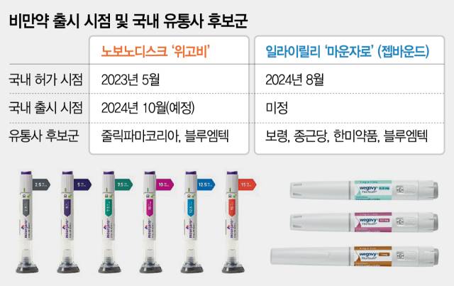 노보노디스크의 비만약 ‘위고비’가 다음달 국내 출시를 확정한 가운데 경쟁사인 일라이릴리의 ‘마운자로’ 출시 시점이 앞당겨질 수 있다는 관측이 나온다. 제약·바이오 업계에서는 어떤 기업이 이들 제품의 국내 유통을 맡을지 촉각을 곤두세우고 있다. 비만 치료제가 전 세계적 열풍을 일으키고 있는 만큼 국내 유통사의 매출도 큰 폭으로 뛸 가능성이 높기 때문이다.