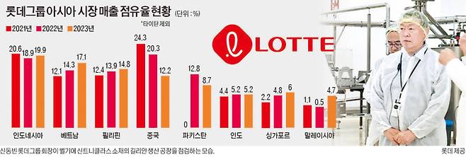 이러한 흐름은 일간스포츠가 단독으로 입수한 2023년 롯데그룹의 아시아 시장 매출 실적(롯데케미칼 핵심 계열사 말레이시아 타이탄 제외)에서 확인할 수 있다. 아시아 중 롯데마트 등의 진출이 활발한 인도네시아의 매출이 1조2811억원으로 점유율 19.9%로 1위를 차지했다. 또 1조973억원의 베트남 시장이 2위로 뒤를 이었다.