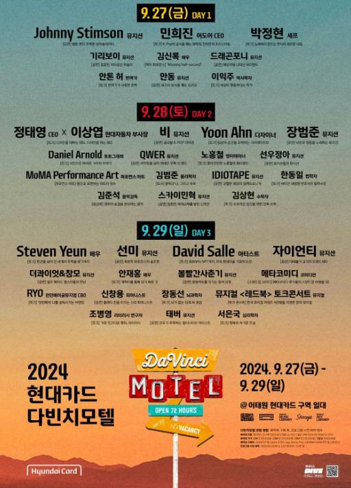 '다빈치모텔'은 토크, 공연, 전시, 버스킹 등 다양한 프로그램을 통해 예술, 학문, 경영, 기술 등 각 분야의 독보적인 아이콘들을 만날 수 있는 현대카드의 문화 융복합 이벤트다.