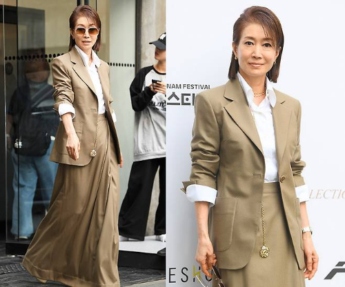 이날 나영희는 화이트 블라우스를 착용하여 깔끔하면서도 세련된 이미지를 연출하며 많은 이들의 이목을 끌었다. 그녀는 이 블라우스에 브라운 컬러의 더블브레스트 재킷과 롱스커트를 매치해 우아하면서도 도회적인 분위기를 자아냈다. 특히 셋업 스타일링이 나영희 특유의 고급스러운 매력을 배가시켰다는 평가다.