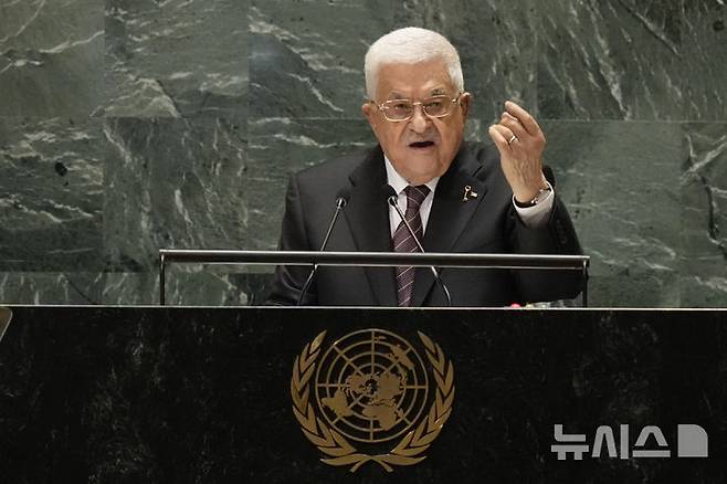 [뉴욕=AP/뉴시스] 마무드 아바스 팔레스타인 자치정부(PA) 수반이 26일(현지시각) 미국 뉴욕의 유엔본부에서 열린 제79차 유엔 총회에서 연설하고 있다. 아바스 수반은 미국이 이스라엘의 폭력을 지원하고 있다면서 “학살을 멈추고 이스라엘에 무기를 보내지 말라”라고 촉구했다. 그가 연설을 마친 후 장내에는 기립박수와 함께 "팔레스타인 해방"이라는 외침이 이어졌다. 2024.09.27.