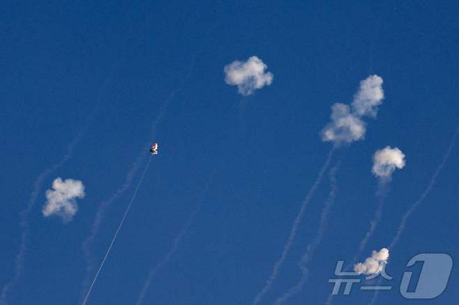 (갈릴리 AFP=뉴스1) 우동명 기자 = 26일(현지시간) 레바논 남부에서 이스라엘 북부 갈릴리를 향해 발사한 로켓을 이스라엘 방공망 아이언 돔이 요격을 하고 있다. 2024.09.27