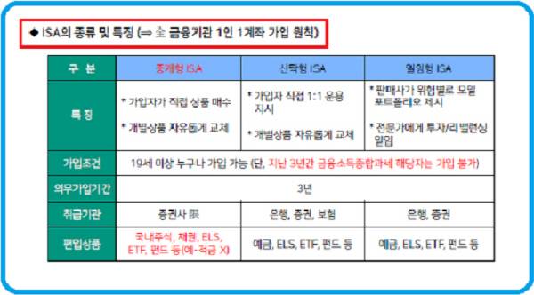 ISA(Individual Savings Account; 개인종합자산 관리계좌)는 예금, 펀드, ELS, ETF, 주식 등 다양한 상품을 하나의 계좌에 담아 투자할 수 있는 통장으로 각 금융상품의 손익을 통산할 수 있다. 가입대상은 19세 이상 거주자 또는 근로소득이 있는 15세 이상 거주자다. 단 직전 3개년 중 1회 이상 금융소득 종합과세 대상자는 제외된다. 납입한도는 연간 2000만원으로 5년간 최대 1억 원 한도 내에서 이월 적립이 가능하다. 기존의 재형저축, 소득공제 장기펀드 가입액은 한도에서 차감 적용된다.