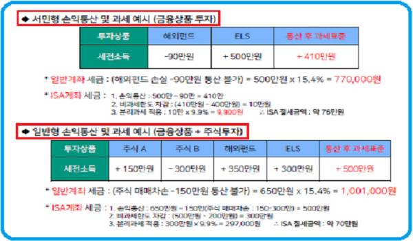 해외펀드, ELS, ETF 등과 같은 금융상품들은 일반계좌보다는 ISA를 활용하는 것이 절세효과를 극대화할 수 있다. 앞서 언급한 바와 같이 15.4%원천징수나 종합과세 상 고율과세(최고세율 49.5%)를 피해 비과세 또는 분리과세 혜택을 볼 수 있기 때문이다. 즉 과세상품이나 고수익 상품을 ISA계좌에 넣어야 절세효과가 올라간다.