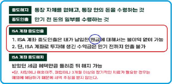 ISA는 이러한 비과세와 분리과세 혜택을 보기 위해서는 3년 이상 계좌를 유지해야 된다는 제약이 있다.(2021년부터 ISA 의무가입기간이 5년에서 3년으로 단축) 의무보유기간 3년 내 중도해지 시 일반과세(15.4%) 적용을 받는다. 따라서 3년 내에 목돈이 필요할 경우라면 굳이 ISA를 만들 필요는 없다. 3년 내 필요 시 원금의 중도인출은 가능하다. 중도 인출하는 경우 출금한 금액만큼 납입한도에서 차감되는 불이익은 있다. 수익과 배당금은 인출이 불가하다.