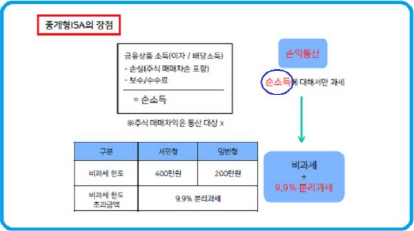 이자소득과 배당소득을 ‘금융소득’이라고 한다. 금융소득이 연 2000만 원 이하면 15.4% 이자소득세 또는 배당소득세를 원천징수한다. 이를 초과하면 초과분과 다른 소득을 합산 과세한다. 이것이 ‘금융소득종합과세’다. ISA계좌를 활용하면 비과세 한도까지 세금을 전액 면제받을 수 있다. 비과세 한도를 초과할 경우 9.9%의 세율로 분리과세되므로 금융소득종합과세와 무관하게 된다. 앞서 직전 3개년에 한번이라도 금융소득종합과세 대상자인 경우 가입할 수 없었던 ISA에 ‘투자형ISA’를 신설해 15.4%의 분리과세 혜택만이라도 주고자 하는 의도인 것이다.