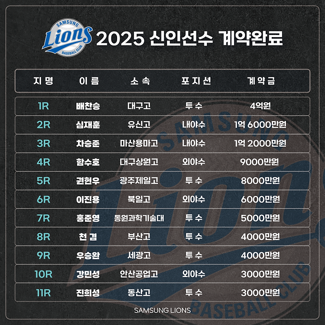 한편 삼성은 2라운드에서 지명한 청소년 국가대표 유신고 내야수 심재훈과 1억6000만원, 3라운드 용마고 내야수 차승준과 1억2000만원에 계약했다. 11명 모두 입단 완료. 2025 신인 선수들은 28일 대구 삼성 라이온즈파크에서 열리는 '루키스데이'를 통해 선수단 상견례와 팬들과 인사하는 시간을 갖는다. 이날 시구는 배찬승이 맡고 2025 신인 지명 선수들이 애국가를 제창한다.