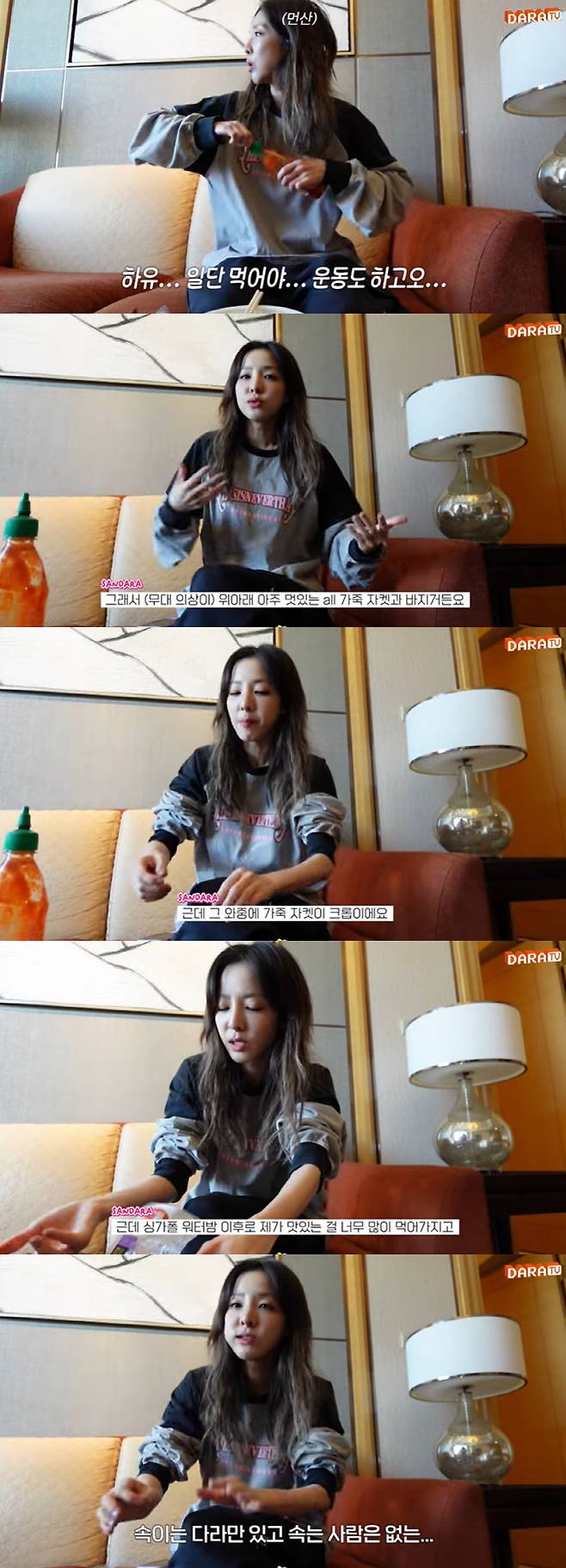 산다라박은 "이번에 몽골이 추워서 위아래 아주 멋있는 가죽 재킷과 가죽 바지다. 그 와중에 가죽 재킷이 크롭이다. 너무 멋있는데 크롭이라 일반식을 할 수가 없다"며 "싱가포르 '워터밤' 이후로 제가 맛있는 걸 너무 많이 먹어서 그때와 다르다. 고독하다. 그래도 내일 무대에 오르면 신이 나겠죠?"라며 다음날 무대를 기대했다.