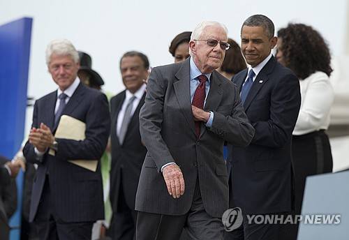 FILE - Former President Jimmy Carter pulls notes out of his pocket before delivering remarks during a ceremony commemorating the 50th anniversary of the March on Washington at the Lincoln Memorial in Washington, Aug. 28, 2013. (AP Photo/Evan Vucci, File) FILE PHOTO