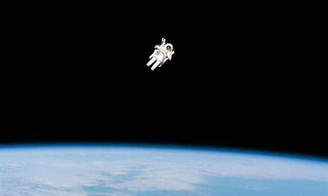 여러 우주비행사들이 20여년 동안 비슷한 방식으로 우주 유영을 하던 가운데 1984년 미국의 브루스 맥캔들리스는 처음으로 줄없는 우주 유영을 선보인다. 그간 우주 유영에서는 우주 공간으로 떠내려가지 않기 위해 우주선과 ‘탯줄’로 연결돼 있었다. 맥캔들리스는 우주왕복선 챌린저호 STS-41-B 임무에서 24개의 질소 추진기가 장착된 유인기동장치(MMU)를 등에 짊어지고, 조이스틱으로 조종해 우주를 활보했다. 그는 챌린저호에서 91m 떨어진 곳까지 비행했으며, 당시 사진은 우주 공간에 홀로 고립된 주인공(샌드라 블럭)을 그린 영화 ‘그래비티’(2013)의 공포를 떠올리게 한다.
