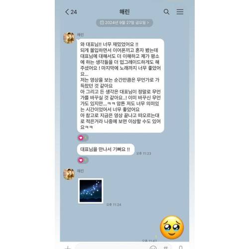 이어 "저는 영상을 보는 순간만큼은 무언가로 가득 찼던 것 같아요"라며 "그리고 든 생각은 대표님이 정말로 무언가를 바꾸실 것 같아요, 이미 바꾸신 무언가도 있지만"이라며 감명받았다는 후기를 더했다. 또 "대표님을 만나서 기뻐요"라며 마무리했다. 민 이사는 감동한 표정의 이모티콘으로 화답했다.