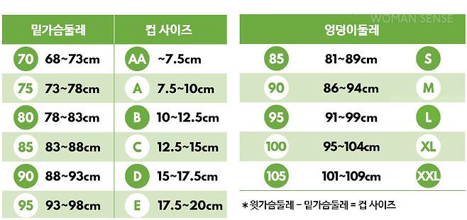 아래 표를 보고 정확한 신체 사이즈를 측정해보세요. 결과에 해당하는 사이즈의 제품을 선택하는 것도 좋지만, 개인의 취향과 선호도에 따라 자유롭게 사이즈를 선택하길 추천합니다. 여성의 체형은 매우 다양하며 원하는 착용감 또한 저마다 다르기 때문에 편안함, 타이트함, 안정감 등 자신이 가장 중요하게 여기는 부분을 중점에 두고 속옷 사이즈를 선택하세요. 윗가슴둘레는 가슴의 가장 높은 부분 둘레, 밑가슴둘레는 가슴 바로 아래 몸통 둘레를 잰 길이입니다. 또환 엉덩이둘레는 엉덩이의 가장 굵은 부분을 둘러 잰 길이를 말합니다.