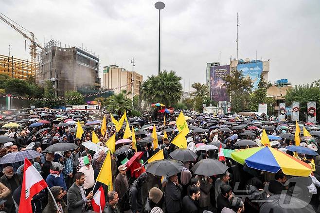 (테헤란 AFP=뉴스1) 우동명 기자 = 28일 (현지시간) 이란 테헤란의 팔레스타인 광장에서 이란 인들이 레바논 무장단체 헤즈볼라의 수장 하산 나스랄라가 이스라엘 군의 공습으로 사망에 분노해 빗 속서 반 이스라엘 시위를 하고 있다. 2024.09.29